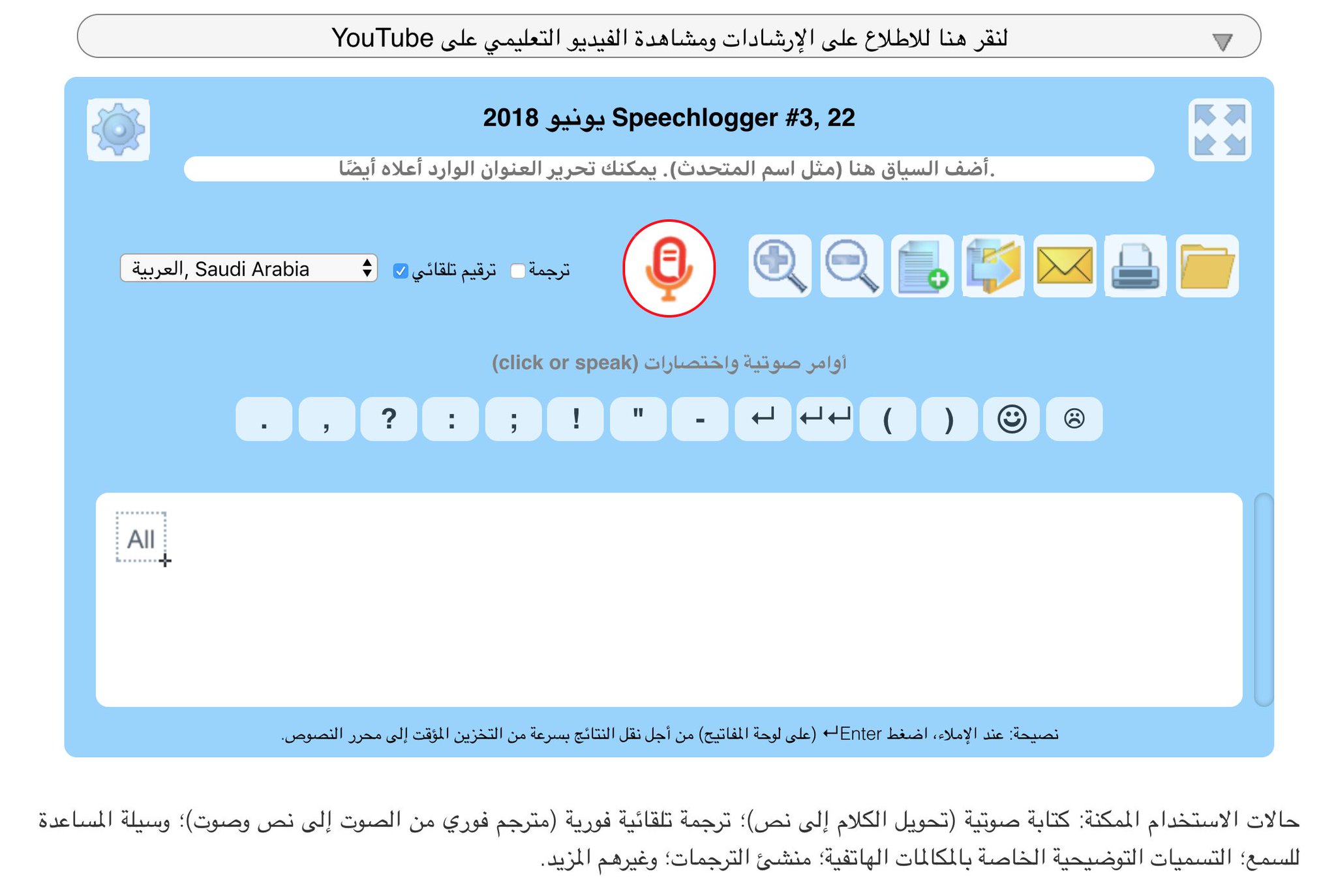 عنك، مع إمكانية ترجمة الكلام إلى أي لغة أخرى، وتصديره إلى ملف وورد أو إرساله بالبريد